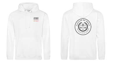 Les deux logos sont brodés. Le premier logo (à l'avant) est le logo officiel de la Faculté de droit de l'UNIGE. Le second est à l'initiative des étudiants et de l'AED.